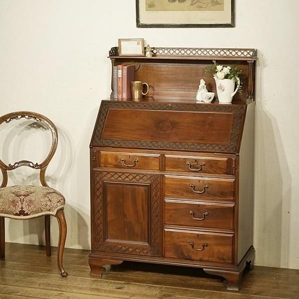 美しいマホガニー材の杢目と随所に彫刻が施された、とても素敵なビューローです。