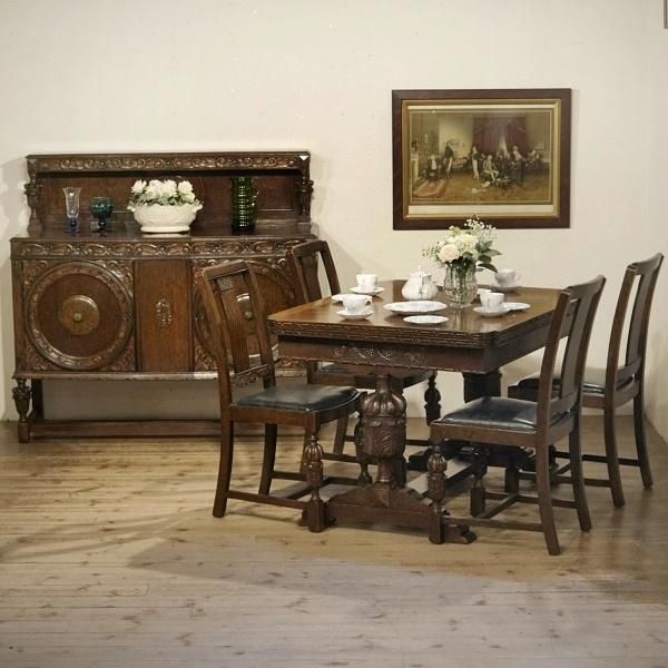 英国アンティーク家具 チェア4脚&ドローリーフテーブル&サイドボード ダイニング6点セット バルボスレッグ B287W