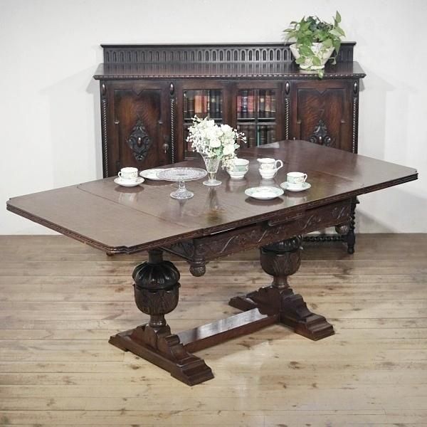 英国アンティーク家具 美しい彫刻 ドローリーフテーブル ダイニングテーブル 伸長式 バルボスレッグ オーク材 B531W