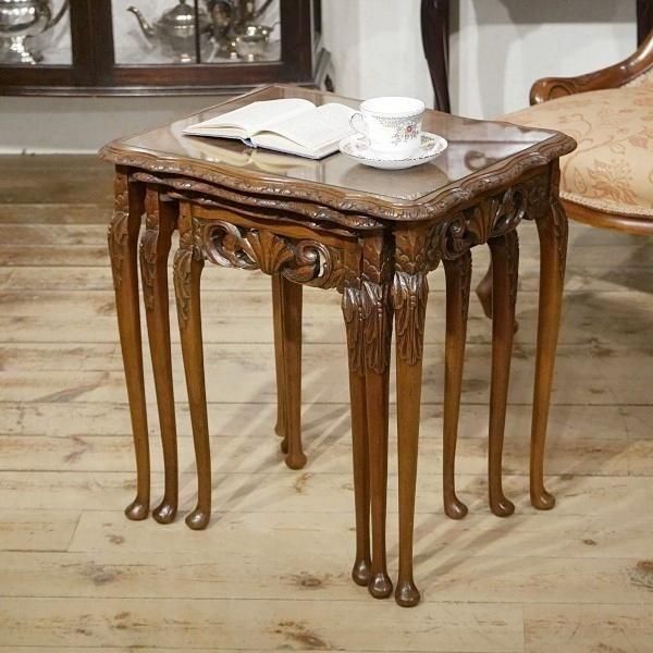 英国イギリスアンティーク家具 ネストテーブル 繊細な彫刻 入れ子式テーブル3点セット 美しい杢目 ウォールナット材 B540