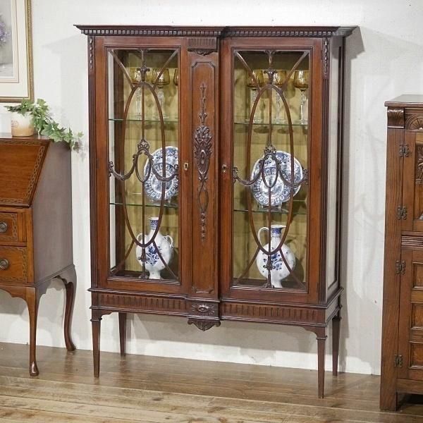 英国アンティーク家具 エドワーディアン 1910年代 ディスプレイキャビネット ショーケース 彫刻 マホガニー材 B570W