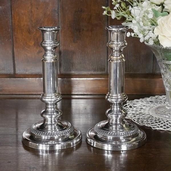英国アンティークのキャンドルスタンドです。2本セットになります。シルバーメッキです。